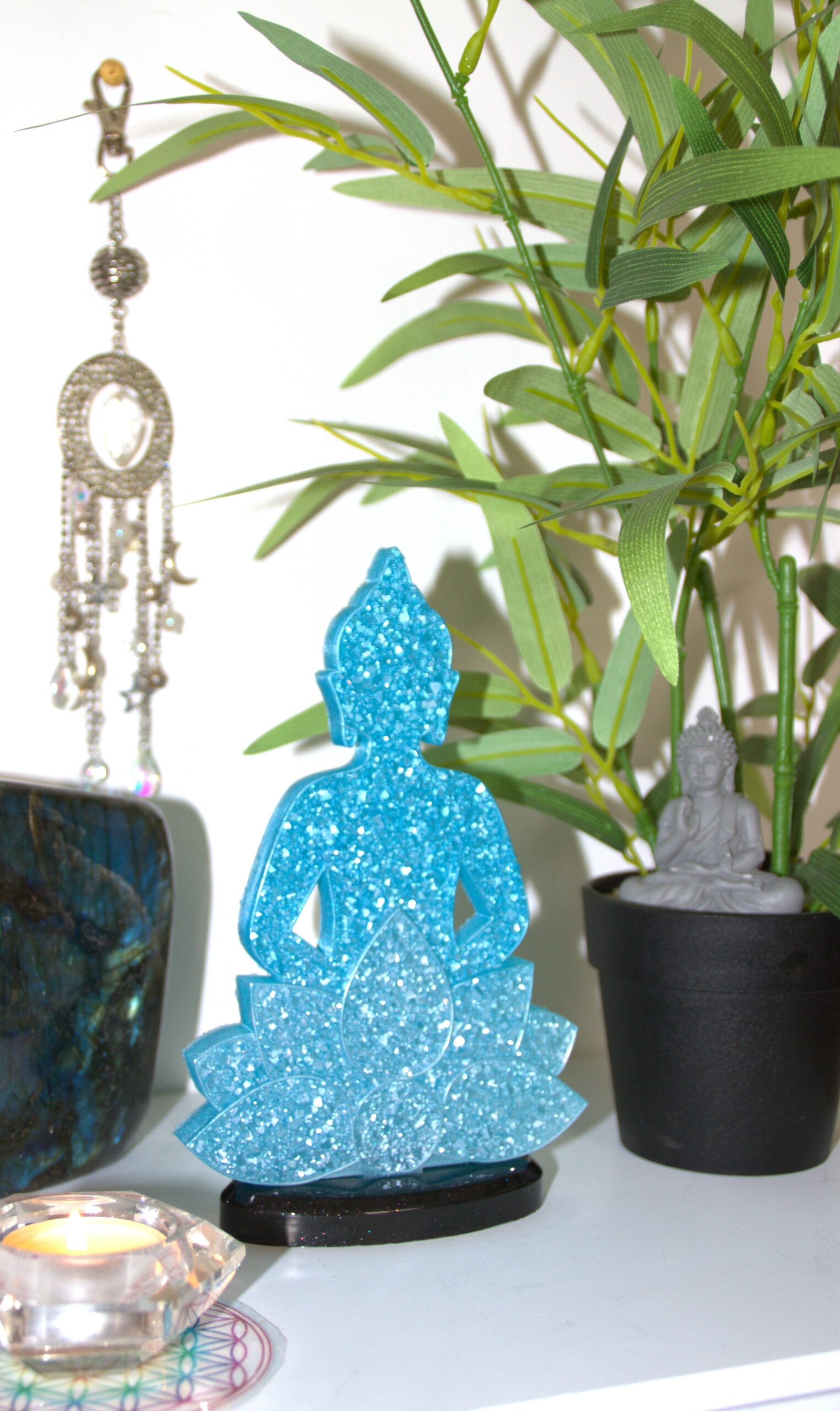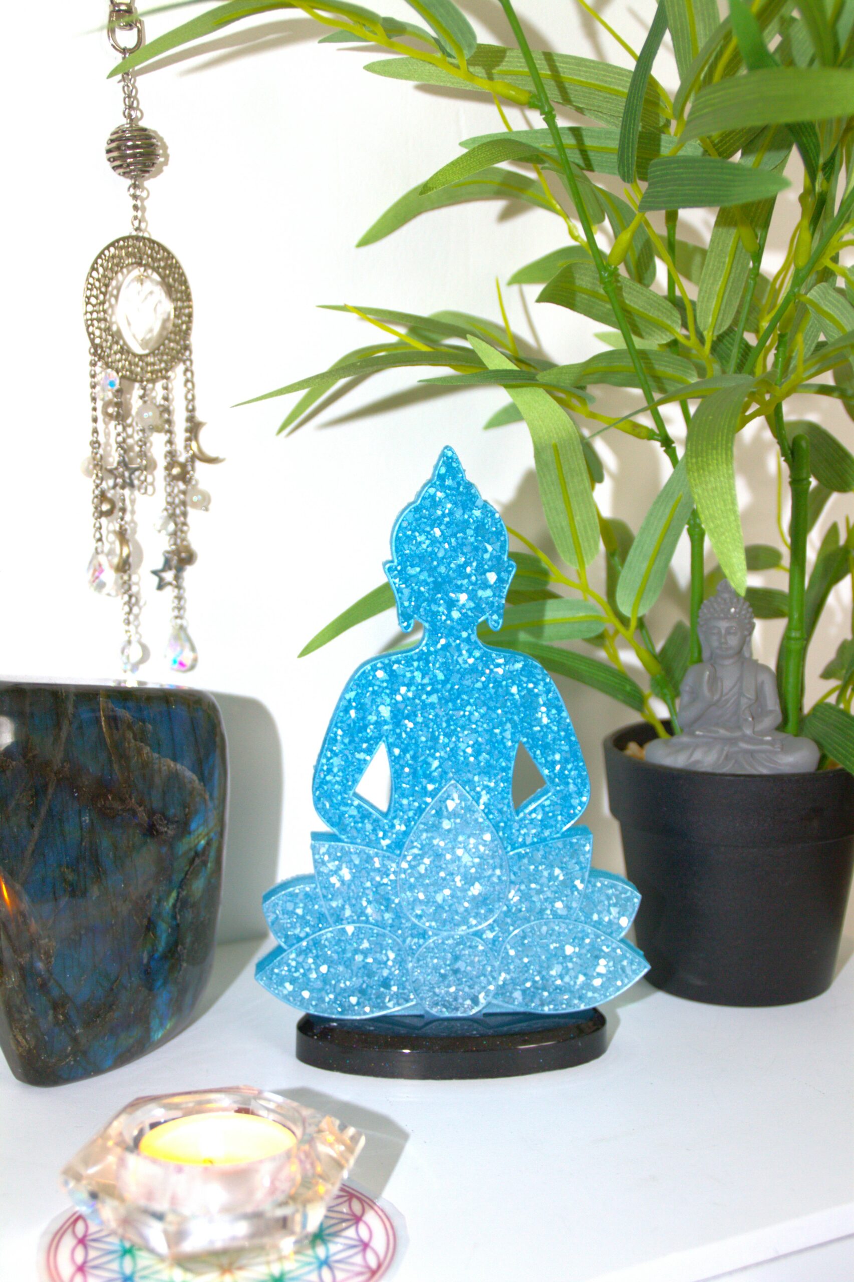 Ce Bouddha est doté de la couleur bleu clair scintillant.