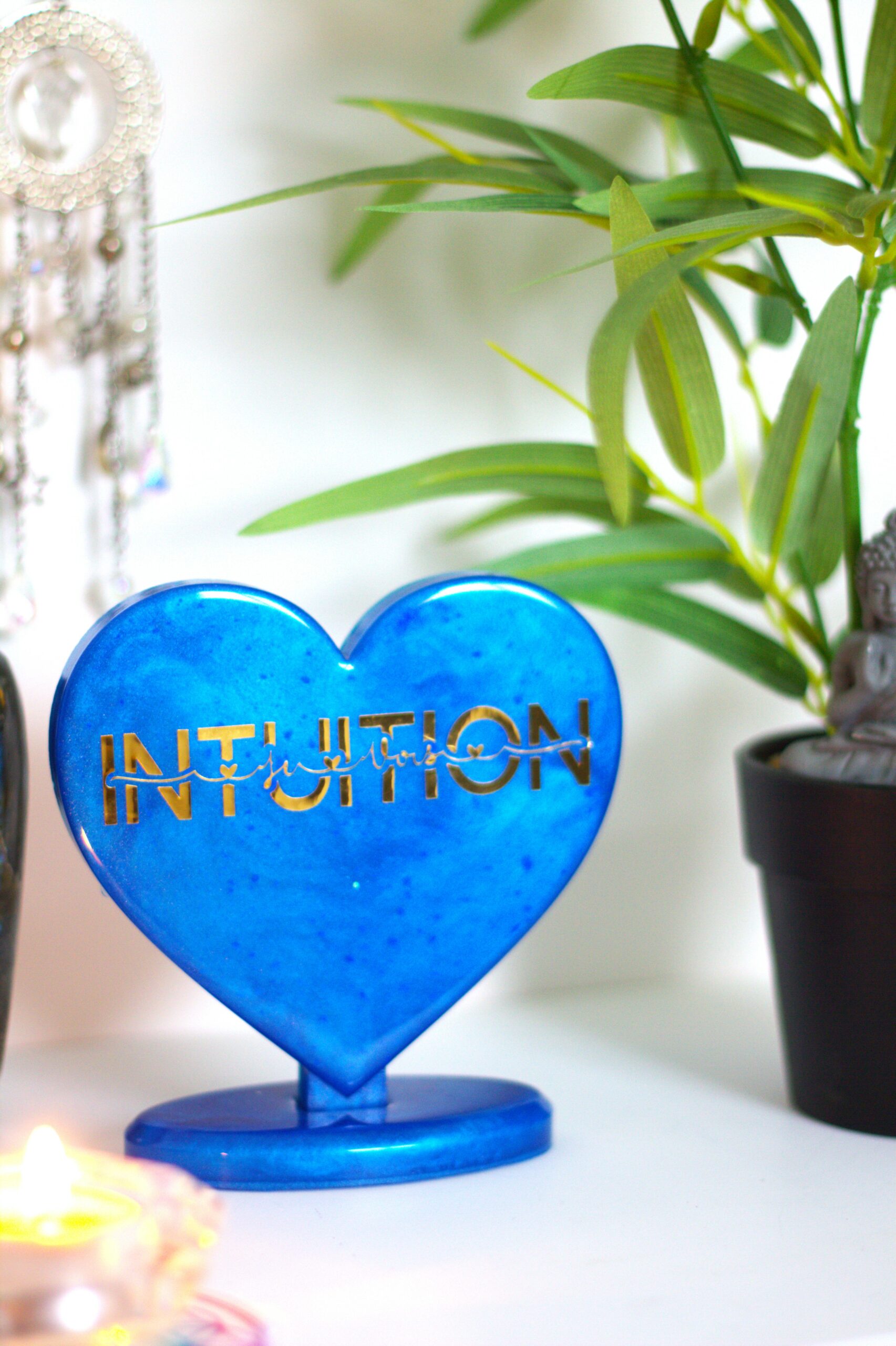 Ce joli cœur brillant est doté de la couleur bleu indigo qui rappel le chakra du 3ème Oeil, l’ouverture à la vision subtile, à son intuition.